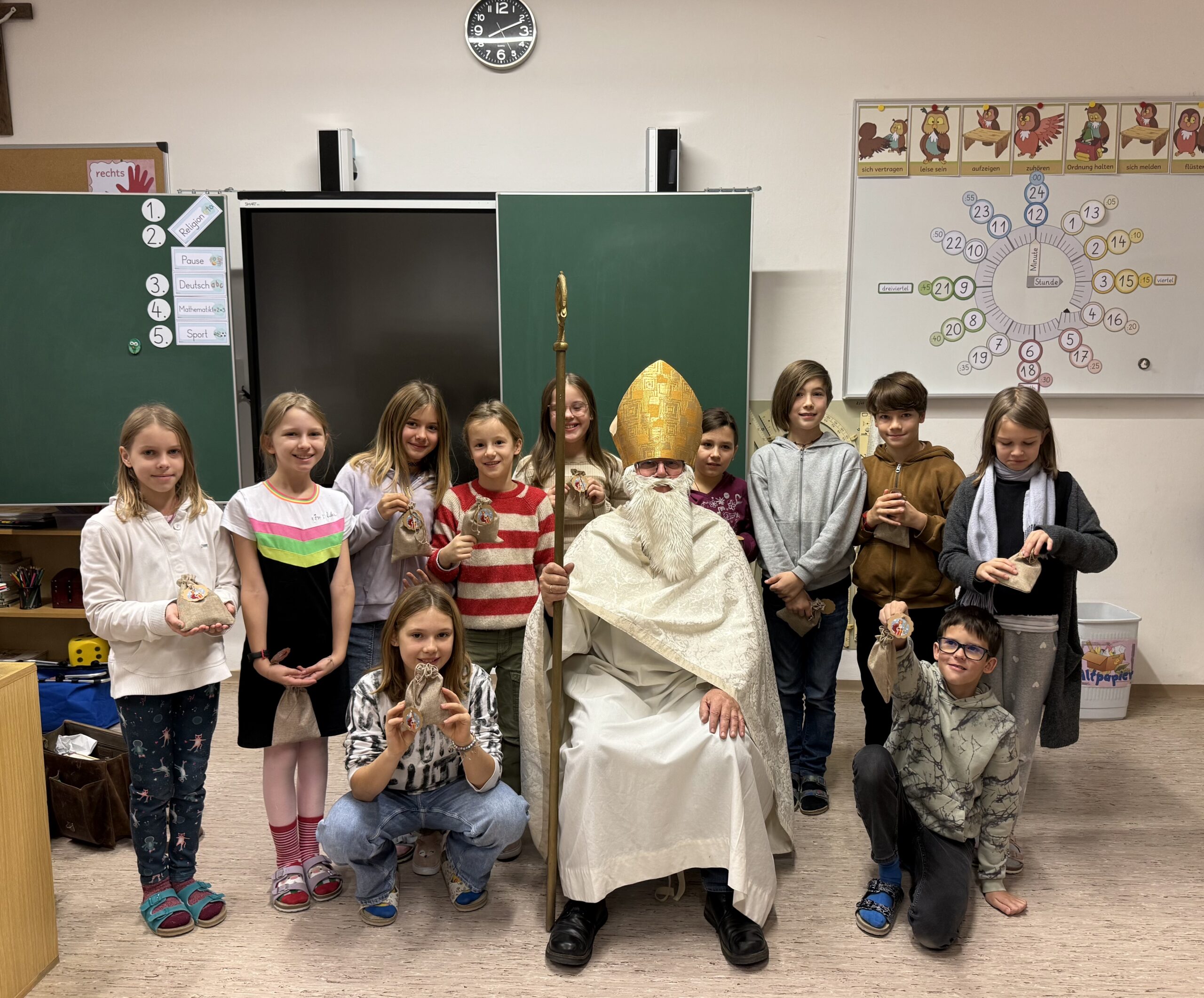 Am 6. Dezember bekamen wir Besuch vom Heiligen Nikolaus. Gemeinsam mit Fr. Religionslehrerin Mucha wanderte er durch das Schulhaus, besuchte alle Klassen und brachte dabei Kinderaugen zum Strahlen. Natürlich erhielten auch alle SchülerInnen ein Nikolaussackerl mit einigen Leckereien. Danke, lieber Nikolaus, dass du uns heuer besucht hast! Wir hoffen, du vergisst uns auch nächstes Jahr nicht!
